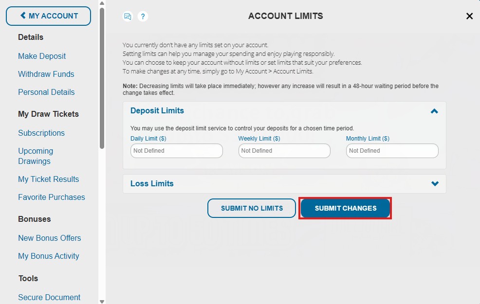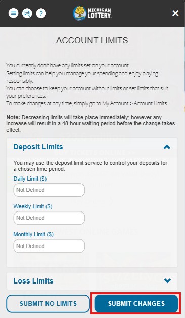 - Enter daily, weekly and/or monthly deposit limit amount and select “SUBMIT CHANGES” to confirm. Note: you can select the down arrow to switch from Weekly to Daily or Monthly Limit.